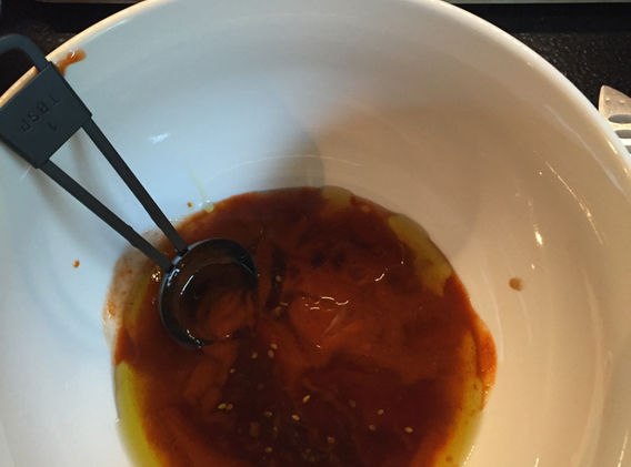 In bowl mix together all sauces, the olive oil, and maple syrup. Cut the cauliflower into bite size pieces and put into the bowl. Mix thoroughly to coat the cauliflower.
